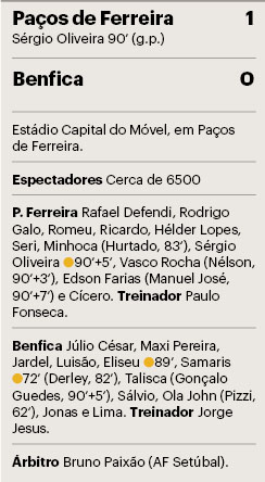 Outro suplente foi determinante para os locais. A equipa de arbitragem assinalou derrube de Eliseu a Hurtado na área, nos minutos finais, e Oliveira inaugurou o marcador. Salvio ainda teve tudo para empatar, mas nesta segunda-feira não era a noite do Benfica, mas do Paços de Ferreira, de regresso aos triunfos após somar só um ponto nas últimas quatro jornadas.