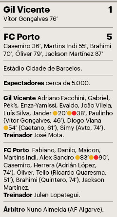 O FC Porto saiu ileso da boa entrada do Gil Vicente e depois dominou sem problemas a partir dos 25 minutos para garantir uma entrada positiva em 2015. Cinco jogadores diferentes marcaram na goleada portista em Barcelos (1-5), facilitada pela expulsão de Jander na parte final da primeira parte, quando a equipa da casa, a única que ainda não venceu na Liga, perdia por 0-1.