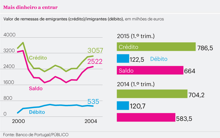 O saldo líquido entre o dinheiro enviado para o país por portugueses no estrangeiro e os valores que os imigrantes mandam de Portugal está em máximos dos últimos 13 anos, tendo atingido os 2522 milhões no ano passado. Em 2005, este indicador, tradicionalmente positivo, estava nos 1717 milhões.