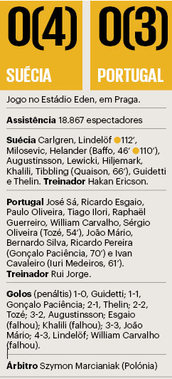 Tudo seria decidido nas grandes penalidades. E aí, com excepção de Khalili (que atirou fraco, para as mãos de José Sá), os suecos foram muito mais assertivos do que os portugueses: Guidetti, Kiese Thelin, Augustinsson e Lindelöf marcaram de forma irrepreensível, sem hipóteses de defesa. A equipa de Rui Jorge começou a vacilar ao segundo pontapé, quando Tozé acertou na trave mas viu a bola ressaltar dentro da baliza e depois sair. Ricardo Esgaio falhou, depois João Mário manteve Portugal agarrado ao sonho mas no penálti decisivo William Carvalho não foi capaz de bater Carlgren.
