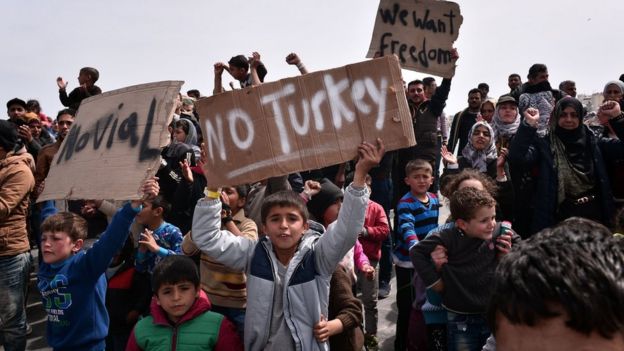 Image copyrightAFPImage captionMigrants on the Greek island of Chios have protested against the deal